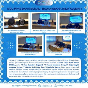 Politeknik Perkapalan Negeri Surabaya (PPNS) resmi memperkuat sinergi dengan dunia industri melalui penandatanganan Nota Kesepahaman (MoU) bersama 5 Badan Usaha Milik Alumni (BUMAL), yaitu PT Duta Samudera Shipyard, PT Ouneer Indonesia Group, PT Maju Bangkit Indonesia Group, PT Cantaka Uni Karya, dan CV. Semkalir Gaswes. Kerja sama ini menjadi langkah strategis dalam menghubungkan pendidikan vokasi dengan kebutuhan industri maritim dan manufaktur, meliputi program magang dan penyerapan lulusan, pengembangan riset terapan, peningkatan kompetensi sumber daya manusia, serta dukungan terhadap proyek industri berbasis inovasi dan teknologi terapan.