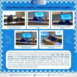 Politeknik Perkapalan Negeri Surabaya (PPNS) resmi memperkuat sinergi dengan dunia industri melalui penandatanganan Nota Kesepahaman (MoU) bersama 5 Badan Usaha Milik Alumni (BUMAL), yaitu PT Duta Samudera Shipyard, PT Ouneer Indonesia Group, PT Maju Bangkit Indonesia Group, PT Cantaka Uni Karya, dan CV. Semkalir Gaswes. Kerja sama ini menjadi langkah strategis dalam menghubungkan pendidikan vokasi dengan kebutuhan industri maritim dan manufaktur, meliputi program magang dan penyerapan lulusan, pengembangan riset terapan, peningkatan kompetensi sumber daya manusia, serta dukungan terhadap proyek industri berbasis inovasi dan teknologi terapan.