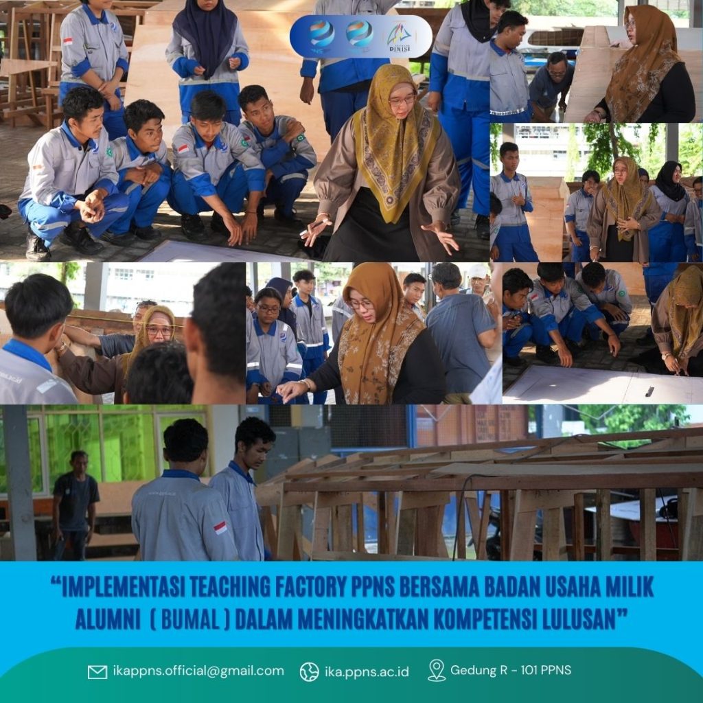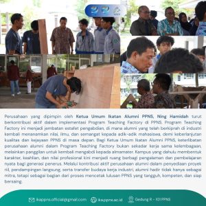 Perusahaan yang dipimpin oleh Ketua Umum Ikatan Alumni PPNS, Ning Hamidah turut berkontribusi aktif dalam implementasi Program Teaching Factory di PPNS. Program Teaching Factory ini menjadi jembatan estafet pengabdian, di mana alumni yang telah berkiprah di industri kembali menanamkan nilai, ilmu, dan semangat kepada adik-adik mahasiswa, demi keberlanjutan kualitas dan kejayaan PPNS di masa depan. Bagi Ketua Umum Ikatan Alumni PPNS, keterlibatan perusahaan alumni dalam Program Teaching Factory bukan sekadar kerja sama kelembagaan, melainkan panggilan untuk kembali mengabdi kepada almamater. Kampus yang dahulu membentuk karakter, keahlian, dan nilai profesional kini menjadi ruang berbagi pengalaman dan pembelajaran nyata bagi generasi penerus. Melalui kontribusi aktif perusahaan alumni dalam penyediaan proyek riil, pendampingan langsung, serta transfer budaya kerja industri, alumni hadir tidak hanya sebagai mitra, tetapi sebagai bagian dari proses mencetak lulusan PPNS yang tangguh, kompeten, dan siap bersaing.