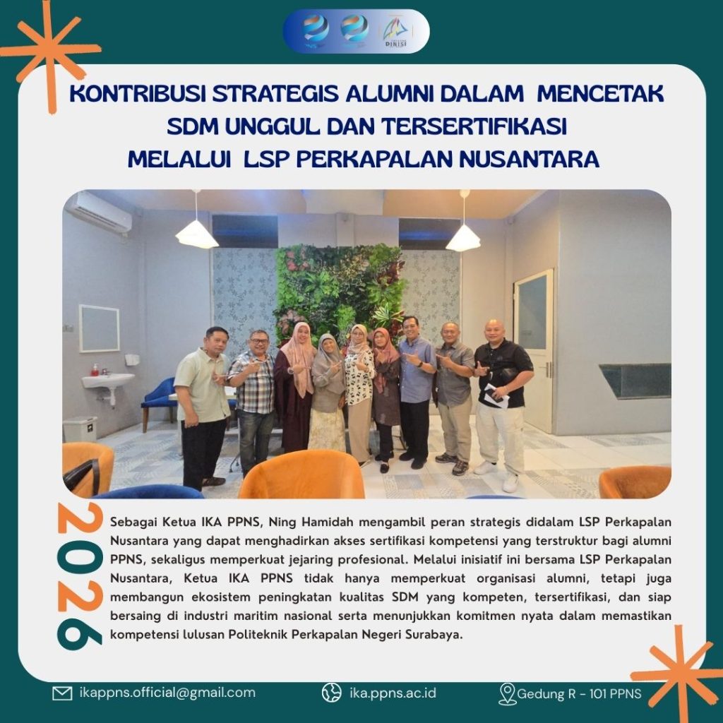 Sebagai Ketua IKA PPNS, Ning Hamidah mengambil peran strategis didalam LSP Perkapalan Nusantara yang dapat menghadirkan akses sertifikasi kompetensi yang terstruktur bagi alumni PPNS, sekaligus memperkuat jejaring profesional. Melalui inisiatif ini bersama LSP Perkapalan Nusantara, Ketua IKA PPNS tidak hanya memperkuat organisasi alumni, tetapi juga membangun ekosistem peningkatan kualitas SDM yang kompeten, tersertifikasi, dan siap bersaing di industri maritim nasional serta menunjukkan komitmen nyata dalam memastikan kompetensi lulusan Politeknik Perkapalan Negeri Surabaya.