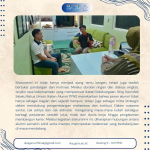 Silaturahmi ini tidak hanya menjadi ajang temu kangen, tetapi juga wadah bertukar pandangan dan motivasi. Melalui obrolan ringan dan diskusi singkat, terjalin rasa kebersamaan yang memperkuat ikatan kekeluargaan. Ning Hamidah Selaku Ketua Umum Ikatan Alumni PPNS menekankan bahwa peran alumni tidak hanya sebagai bagian dari sejarah kampus, tetapi juga sebagai mitra strategis dalam mendukung pengembangan mahasiswa dan institusi. Dalam suasana santai, cak aditya dan cak aldinata mengenang masa-masa kuliah sekaligus berbagi perjalanan setelah lulus, mulai dari dunia kerja hingga pengalaman membangun karier. Melalui kegiatan silaturahmi ini, diharapkan hubungan antara alumni semakin solid serta mampu menciptakan kolaborasi yang berkelanjutan di masa mendatang.