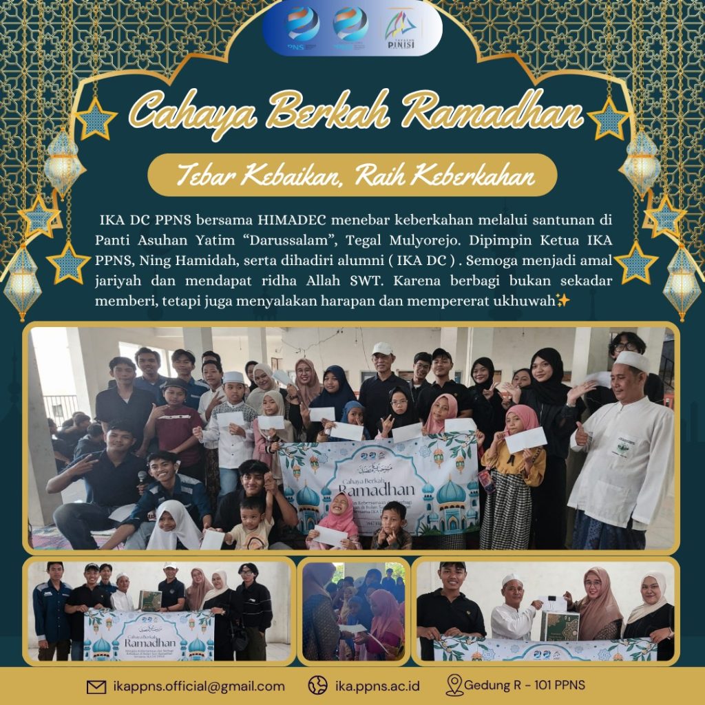 IKA DC PPNS bersama HIMADEC menebar keberkahan melalui santunan di Panti Asuhan Yatim “Darussalam”, Tegal Mulyorejo. Dipimpin Ketua IKA PPNS, Ning Hamidah, serta dihadiri alumni ( IKA DC ) . Semoga menjadi amal jariyah dan mendapat ridha Allah SWT. Karena berbagi bukan sekadar memberi, tetapi juga menyalakan harapan dan mempererat ukhuwah✨